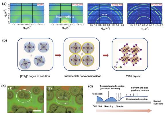 (a) 2D GIXD images of printing perovskite at different stages of drying process, (b) the nano-assemble model of perovskite crystallization, (c) the selected in-situ microcopy images of the perovskite films and (d) the scheme of the periodic and rhythmic crystallization.