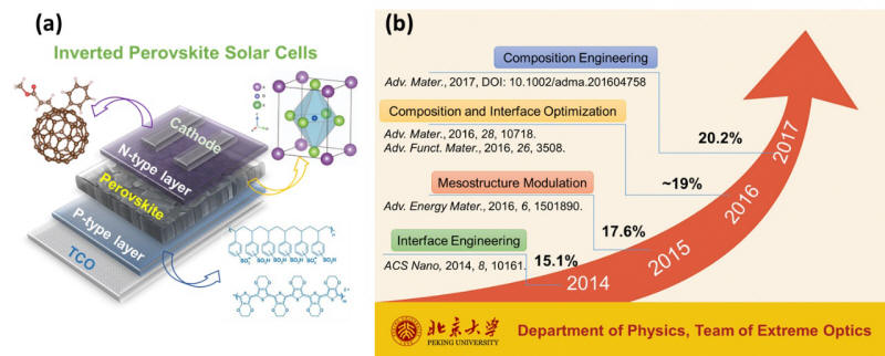 Recently, Prof. Rui Zhu and Prof. Qihuang Gong at Department of Physics, Peking University working with the collaborators, Dr. Wei Zhang from University of Surrey, Dr. Feng Liu and Prof. Thomas P. Russell from Lawrence Berkeley National Laboratory, and Prof. Henry J. Snaith from University of Oxford, have made great efforts in highly efficient inverted planar heterojunction perovskite solar cells. Eventually, they have achieved power conversion efficiencies exceeding 20% by using a simple antisolvent-free one-step solution process. This result has demonstrated that the inverted-structure perovskite solar cells have great potential in the research field of photovoltaics.