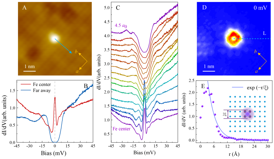 Figure 1. A,B, Isolated Fe adatom and the tunneling spectra on single-layer FeSe. C, Tunneling spectra collected along the arrow in A. D, Zero-bias conductance imaging for the adatom in A. E, Exponential fit to the linecut L in D.