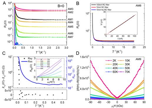 Figure 2 Evidence of quantum metallic state. (A) The temperature dependence of sheet resistance of the films in superconducting state and quantum metallic state (AM1-AM7). The resistance saturation with decreasing temperature in the low temperature regime is the main characteristic of quantum metallic state. (B) The sheet resistance of a quantum metallic state film (AM8) at ultralow temperatures. The resistance saturation behavior remains almost the same with or without the filters. Inset: the linear voltage-current characteristic of the quantum metallic state film. (C) The temperature dependence of Hall resistance (Rxy) and longitudinal resistance (Rxx) of a typical quantum metallic state film (AM9). The Rxy approaches zero at low temperatures while the Rxx remains finite, which is the characteristic of quantum metallic state. Inset: The magnetic field dependence of Rxy at various temperatures for the quantum metallic state film. (D) The giant magnetoresistance of the quantum metallic state film (AM9), consistent with the theoretical expectation of quantum metallic state.