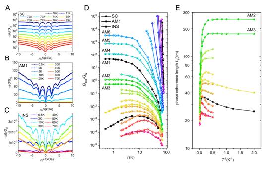 Figure 3 The evolution of Cooper pairs coherence through the quantum phase transition. (A-C) Magnetoconductance oscillations of three representative YBCO nanopore films at various temperatures. Shown are the data from a (A) superconducting state film (SC), (B) anomalous metallic sate film (AM1), (C) insulating state film (INS). (D) Temperature dependence of magnetoconductance oscillations amplitude (Gosc) of all the YBCO films. For the quantum metallic state films, Gosc saturates with decreasing temperature at around 5 K. In contrast, Gosc diverges at low temperatures for superconducting state films, and Gosc initially increases and drops at low temperatures for insulating state film. (E) The saturation of the phase coherence length at low temperatures in the quantum metallic state films, revealing a possible formation mechanism of quantum metallic state.