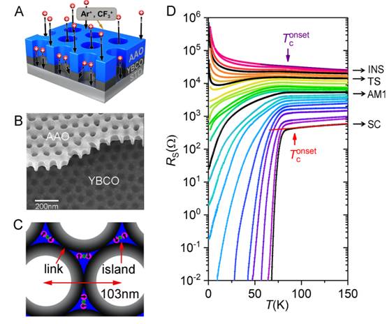 Figure 1. The superconductor-quantum metal-insulator transition in nanopore modulated YBCO thin films. (A) Illustration of the fabricating process of nanopore modulated YBCO thin films by reactive ion etching through AAO mask. (B) The scanning electron microscope (SEM) image of nanopatterned YBCO films. (C) Illustration of the nanopatterned YBCO films (D) Temperature dependence of resistance for the nanopatterned YBCO films for different etching times. The resistance vs temperature curves of four representative films marked as superconducting (SC), anomalous metallic (AM1), transitional (TS) and insulating (INS) are shown in black.