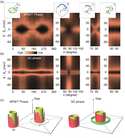 FIG. 1: (color online) The comparison of gap anisotropies taken in the AFM/T and superconducting phases. (a) The SDW gap distributions on different Fermi surface sheets taken in the AFM/T phase on sample #1. (b) is the same as a, but taken in the superconducting phase on sample #2. (c) The schematic of the SDW and superconducting gap anisotropies.