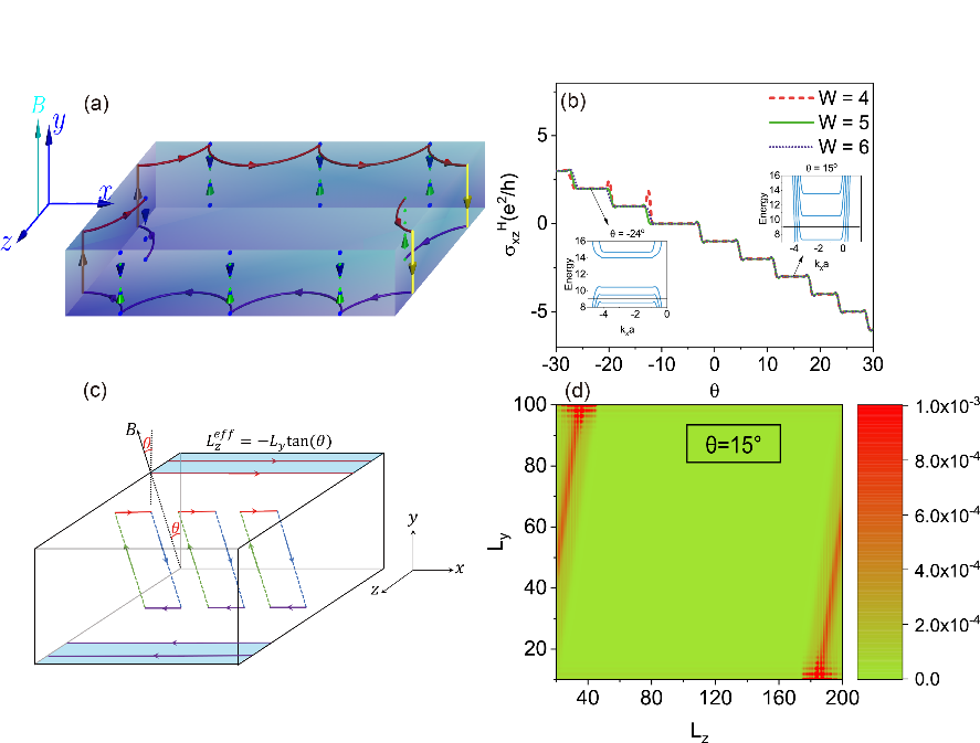 In recent years, the three-dimensional quantum Hall effect in topological semimetals has attracted extensive attention. In 2017, Prof. Hai-Zhou Lu’s group from Southern University of Science and Technology and Prof. Xin-Cheng Xie’s group from Peking University proposed a new mechanism to realize the three-dimensional effect in topological semimetals with the combination of the Fermi arcs at opposite surfaces. However, for this new three-dimensional quantum Hall effect, the physical picture of the edge states-how the edge states evolve and form a closed trajectory-and how it is affected by a tilted magnetic field is still missing. Recently, Prof. Xin-Cheng Xie from Peking University and his collaborators investigate the three-dimensional quantum Hall effect in Weyl semimetals and elucidate a global picture of the edge states. This work has been published in Physical Review Letters [Phys. Rev. Lett.125, 036602.https://link.aps.org/doi/10.1103/PhysRevLett.125.036602].