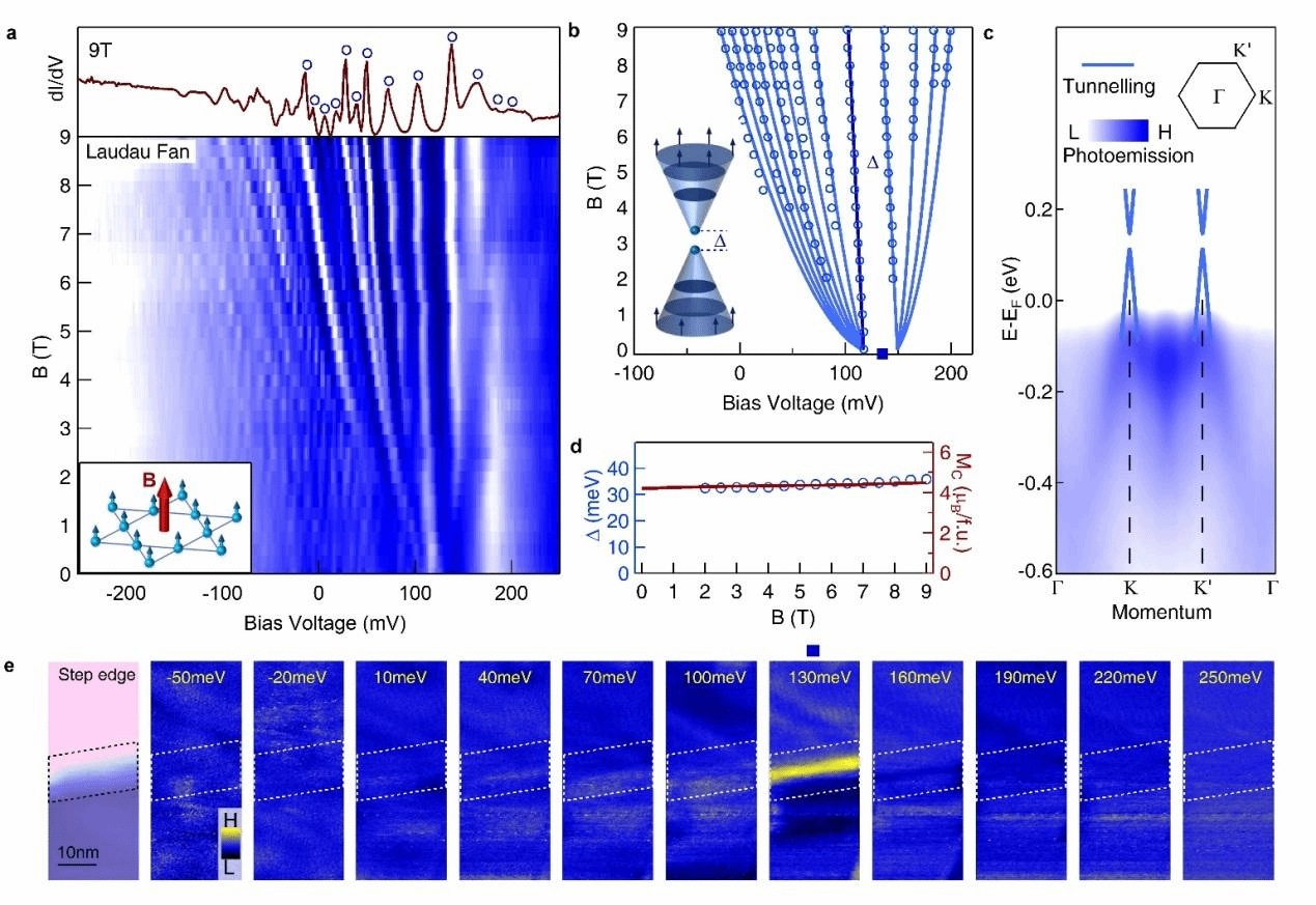 Figure 1. The topological fermions in TbMn6Sn6.a, Landau fan diagram of the kagome lattice.b, Fitting the Landau fan data with spin-polarised and topologically gapped Dirac dispersions.c, Comparison of the Dirac dispersion obtained from tunneling and photoemission.d,Dirac gap size and bulk out-of-plane magnetization as a function of the magnetic field.e, dI/dV maps taken within the Chern gap energy (130meV) show pronounced step edge states.