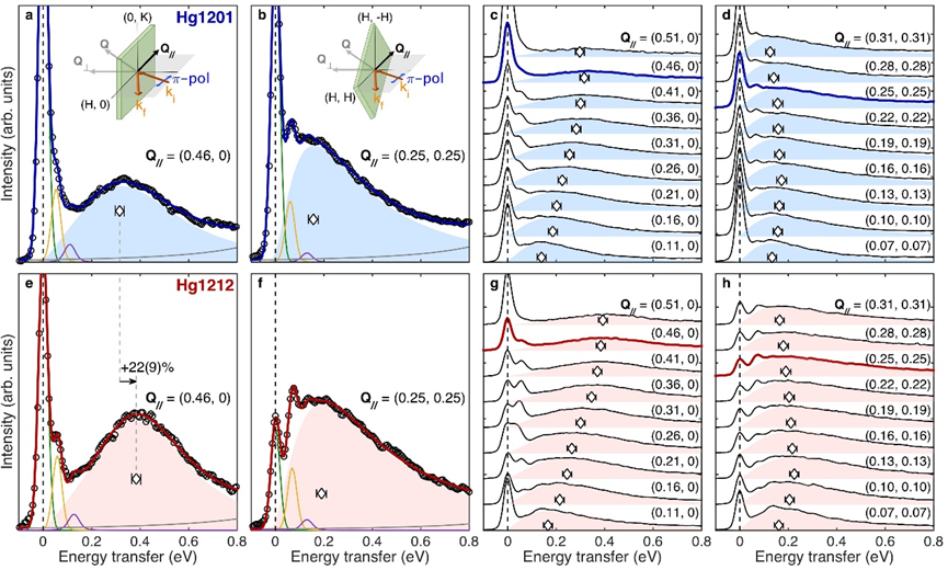 Figure 1. (a-d) RIXS data measured on Hg1201 at in-plane momentum transfers Q// quoted in reciprocal lattice units. Shaded peaks are fitted paramagnon signals. (e-h) Same as (a-d), but for Hg1212, the characteristic energy of which is higher than Hg1201 by 20-30%.