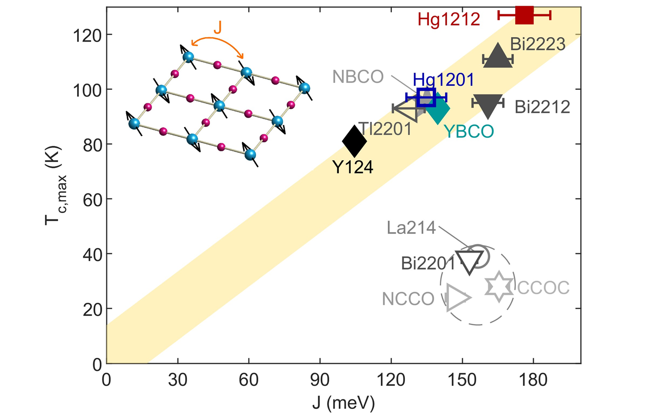 Figure 2. Tc of various cuprates at optimal or the best available doping, plotted versus J extracted from measurements of (para)magnons. J is the nearest-neighbor antiferromagnetic interaction (inset).