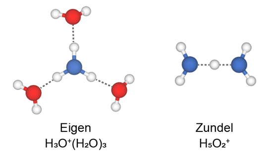 Figure 1 The structural models of Eigen and Zundel cations. Eigen cation: one flat hydronium ion at the center is H-bonded with three water molecules; Zundel cation: two water molecules share an extra H+ in a symmetric H-bonding configuration.