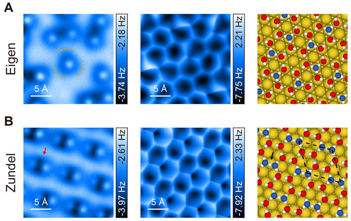 Figure 2 High-resolution AFM images and atomic structures of self-assembled Eigen (A)/Zundel (B) water monolayer on Au(111) surface. O atoms in the hydronium ions and water molecules are denoted as blue and red spheres, respectively.