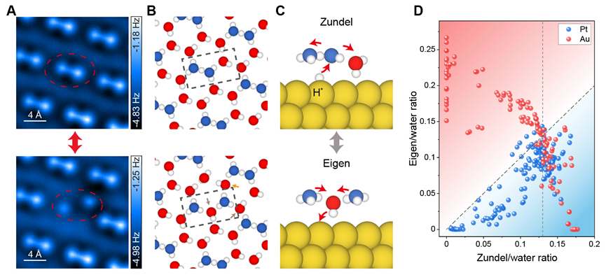 Figure 3 (A, B) AFM images (A) and the schematic H-bonding arrangements (B) of the ordered Zundel cations and the tip-induced two Eigen cations in the hydronium-water layer. (C) Schematic models of the interconversion between the Zundel and Eigen cations. (D) Density correlation between the Eigen and Zundel cations on the Au(111) and Pt(111) surfaces.