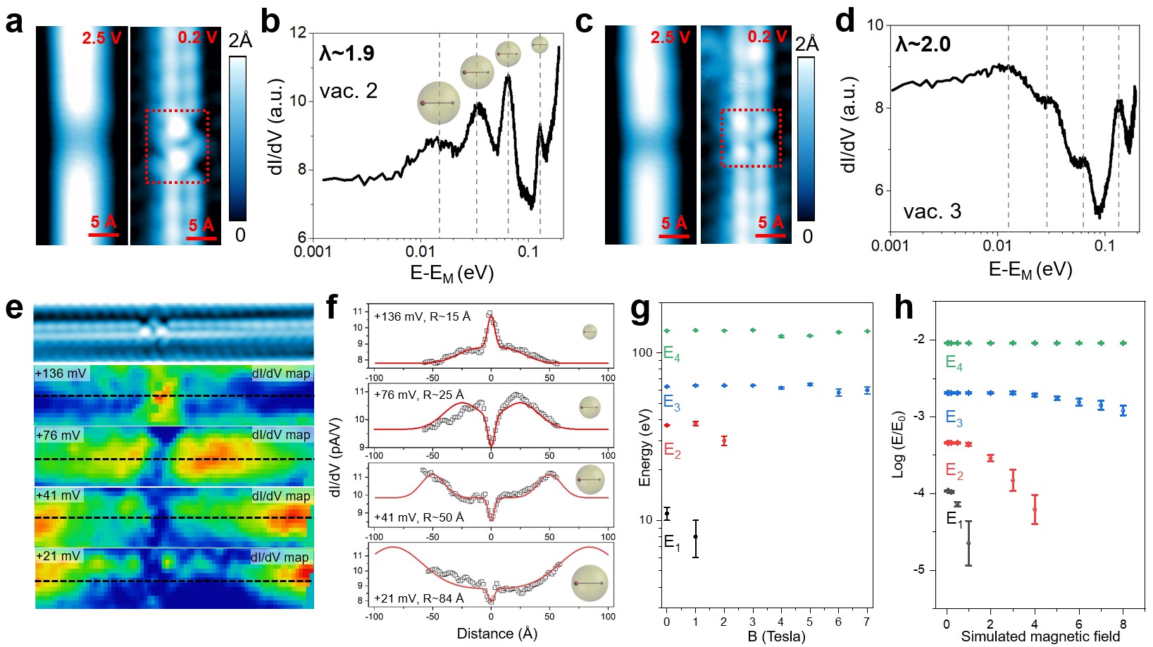 Figure: (a-d) High-resolution STM images of the HfTe5 surface vacancies (a,c) and the corresponding dI/dV spectra (b,d). Four log-periodic dI/dV peaks indicate the quasi-bound states showing discrete scale invariance at the atomic vacancies (charged impurities). (e-f) dI/dV maps taken at a series of resonance energies around the atomic vacancy (e) showing the quasi-bound states with discrete scale invariant radii (f). (g) Evolution of the energies of quasi-bound states with increasing magnetic fields. The quasi-bound states at lower energies become wider and eventually invisible, meanwhile the energies of quasi-bound states move gradually towards the EF. (h) Simulated magnetic-field-dependent energies of the quasi-bound states (normalized by the energy unit E0), which are consistent with the experimental results shown in (g).