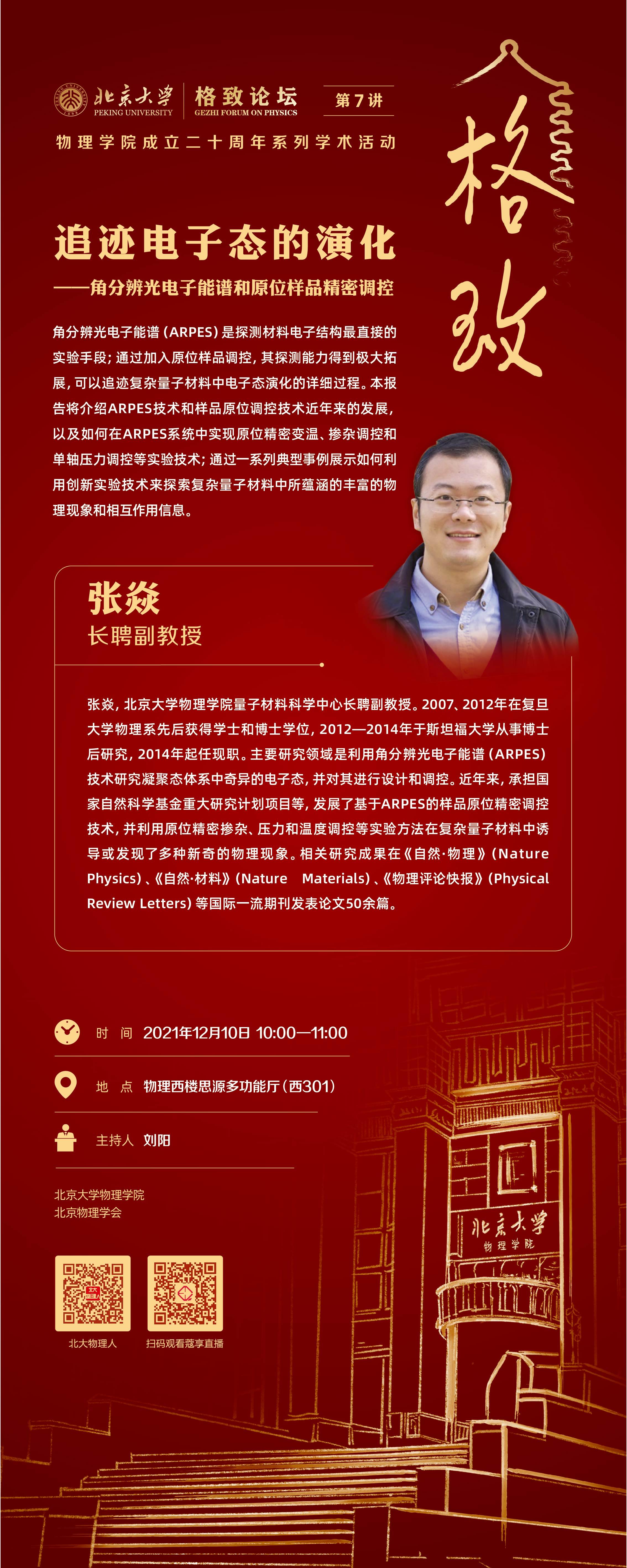 主讲人简介:张焱,北京大学物理学院量子材料科学中心长聘副教授。2007、2012年在复旦大学物理系先后获得学士和博士学位,2012—2014年于斯坦福大学从事博士后研究,2014年起任现职。主要研究领域是利用角分辨光电子能谱(ARPES)技术研究凝聚态体系中奇异的电子态,并对其进行设计和调控。近年来,承担国家自然科学基金重大研究计划项目等,发展了基于ARPES的样品原位精密调控技术,并利用原位精密掺杂、压力和温度调控等实验方法在复杂量子材料中诱导或发现了多种新奇的物理现象。相关研究成果在《自然·物理》(Nature Physics)、《自然·材料》(Nature Materials)、《物理评论快报》(Physical Review Letters)等国际一流期刊发表论文50余篇。