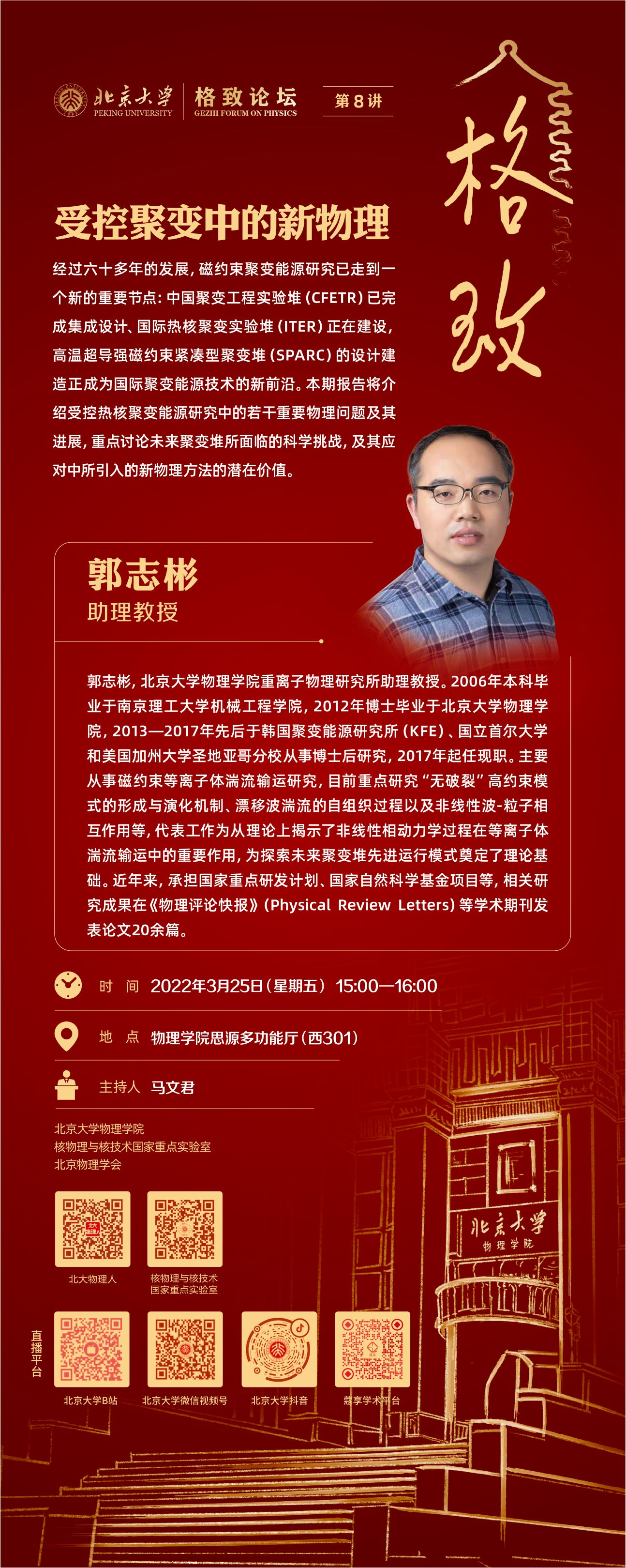 主讲人简介: 郭志彬,北京大学物理学院重离子物理研究所助理教授。2006年本科毕业于南京理工大学机械工程学院,2012年博士毕业于北京大学物理学院,2013—2017年先后于韩国聚变能源研究所(KFE)、国立首尔大学和美国加州大学圣地亚哥分校从事博士后研究,2017年起任现职。主要从事磁约束等离子体湍流输运研究,目前重点研究“无破裂”高约束模式的形成与演化机制、漂移波湍流的自组织过程以及非线性波-粒子相互作用等,代表工作为从理论上揭示了非线性相动力学过程在等离子体湍流输运中的重要作用,为探索未来聚变堆先进运行模式奠定了理论基础。近年来,承担国家重点研发计划、国家自然科学基金项目等,相关研究成果在《物理评论快报》(Physical Review Letters)等学术期刊发表论文20余篇。