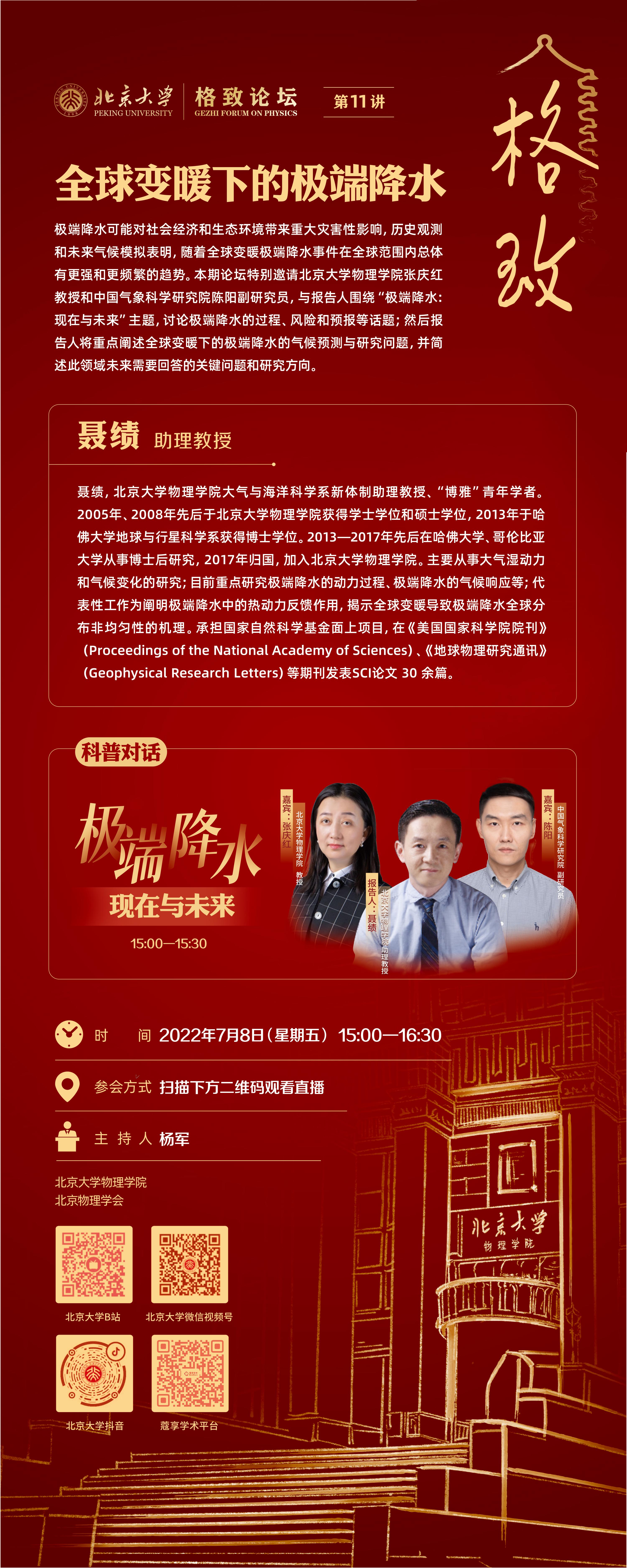 极端降水可能对社会经济和生态环境带来重大灾害性影响,历史观测和未来气候模拟表明,随着全球变暖极端降水事件在全球范围内总体有更强和更频繁的趋势。本期论坛特别邀请北京大学物理学院张庆红教授和中国气象科学研究院陈阳副研究员,与报告人围绕“极端降水:现在与未来”主题,讨论极端降水的过程、预报和风险等话题;然后报告人将重点阐述全球变暖下极端降水的气候预测与研究问题,并探讨此领域未来的一些关键问题和方向。