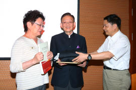北京大学物理学院党委书记陈晓林老师向钟先生夫妇赠送此次“钟盛标物理教育基金”论坛文集及纪念品,陈老师在之后致辞中对钟先生夫妇为物理学院学生教育工作长期以来的帮助与支持表达了感激之情。