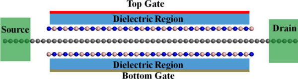 FigureThe dual-gated field effect transistor based on the h-BN/graphene/h-BN sandwich structure. (Top) Schematic model,