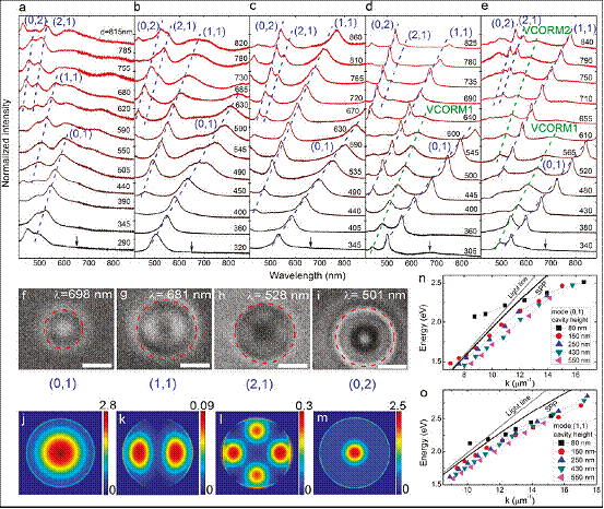 Figure: Spontaneous excitation of plasmonic resonant modes and vertical cavity resonant modes in Ag nanocavity via CL spectroscopy analysis. (a-e) CL spectra of nanocavities with 80, 150, 250,430, and 550 nm heights, respectively. The numbers on the right side of the figures indicate the diameters of the cavities in nm. The spectra were obtained when the electron beam was incident near the centers of the cavities. The plasmonic modes are classified and indicated with blue dotted lines and characters, respectively. Spectra are offset vertically for clarity. (f) Typical monochromatic CL image at a resonant wavelength of 698 nm for a cavity with a 490 nm diameter. (g-i) Typical monochromatic CL images at resonant wavelengths of 681, 528, and 501nmfor a cavity with a 765nmdiameter, respectively. The red dashed circles show the boundaries of the cavities. Scale bars are 500 nm. (j-m) Calculated intensity patterns of the out-of-plane electric components for the plasmonic modes (0, 1), (1, 1), (2, 1), and (0, 2), respectively. (n, o) Dispersions of plasmonic modes (0, 1) and (1, 1) in the nanocavities. The gray and black lines respectively represent the dispersions of light in vacuum and SPPs on an infinite Ag film.
