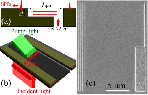 By engaging a compact asymmetric single slit coated with a photorefractive polymer, surface–plasmon–polariton (SPP) generation was efficiently controlled by a pump beam, as shown in the Figure below. In such structure, the nonlinear light–matter interaction is enhanced because of the cavity effect, which increases the sensitivity of SPPs to the surrounding dielectric. By varying the real part of the refractive index together with an interferometric configuration, high on/off switching ratios are achieved. Moreover, the SPP generation and modulation processes are integrated in the same asymmetric single slit, which makes the device ultracompact. Experimentally, a high on/off switching ratio of > 20 dB and phase variation of > π were observed with the device lateral dimension of only about 2 μm. To our knowledge, this is the highest on/off switching ratio in such an ultracompact device.