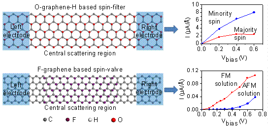 In terms of dimension, all materials can be classified into zero-dimensional, one-dimensional, two-dimensional, or three dimensional materials. The discovery of graphene in 2004 rendered us a real 2D material for the first time, triggered a deep research in this field, and won the Nobel Prize for Physics in 2010. Other than its high mobility, which can be utilized to prepare high-performance field effect transistor, graphene also has a long spin relaxation time and length, and this makes graphene a promising material in applications of spintronics. But the magnetoresistance (MR) of graphene-based spin-valves is quite small. By now the maximum MR observed is down to 10%. A marked feature of 2D materials is the exposure of two surfaces, which provide a freedom for structure tuning. Under the direction of Prof. Jing Lu and Prof. Zhengxiang Gao at School of Physics in Peking University, using first principle study of density functional theory, undergraduate student Linze Li and graduate student Rui Qin et al. found that, upon functionalization on one side or different functionalizations on two sides, the spintronic performance of graphene can be much enhanced. Graphene functionalized with O on one side and H on the other side (O-graphene-H) is found to be a ferromagnetic metal with a spin-filter efficiency up to 54% at the finite bias of 0.6 V. The ground state of graphene semi-functionalized with F (F-graphene) is an antiferromagnetic semiconductor with a bandgap of 1.17 eV, while its ferromagnetic state has a metallic nature. By controlling the external magnetic field, one can change the magnetic state of the structure and thus control the current. The resulting room-temperature MR is up to 2200%, which is one order of magnitude larger than the available experimental values. This work opens new avenues for application of graphene in spintronics devices, and the result of this work has been published online on ACS Nano. (http://pubs.acs.org/doi/abs/10.1021/nn102492g)
