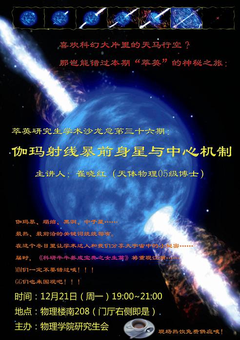 崔晓红同学主要从事高能天体物理方面的研究工作,在本期这“萃英”沙龙中,她报告的题目是“伽玛射线暴前身星与中心机制”(点击下载)。